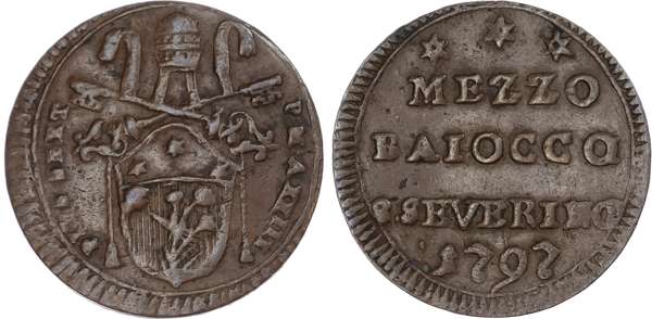 Italy, Papal States. San Severino, Pius VI CU Mezzo Baiocco. 1797.