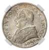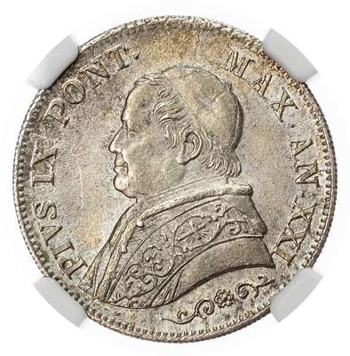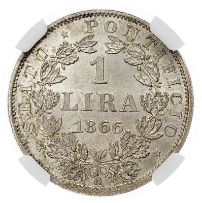 Italy, Papal States. Pius IX AR Lira. 1866R XXI. PIVS IX PON٠MAX٠AN٠XXI pattern below bust left / ✷ STATO PONTIFICIO ✷ denomination and date centre of wreath. KM 1378. 5g, 23mm, 6h. NGC Graded MS 65+.