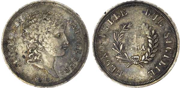 Italy, Naples. Jaochim Murat AG 1 Lira. 1813. GIOACCHINO NAPOLEONE. Date below bust right / REGNO DELLE DUE SICILIE. Denomination in wreath centre. KM 257. 5.00g, 23.05mm, 12h.