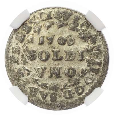 Italy, States, Savoy. Victor Amadeus II Bi Soldo. 1709. VIC.AM.II.D.G.D.SAB.PR.PE.REX.CY, date, SOLDI UNO / Cross with crowns at angles and crosses. MIR: 873. 1.9g, 19mm, 12h. NGC Graded MS 64+. Top Pop. Finest known of this very rare coin.