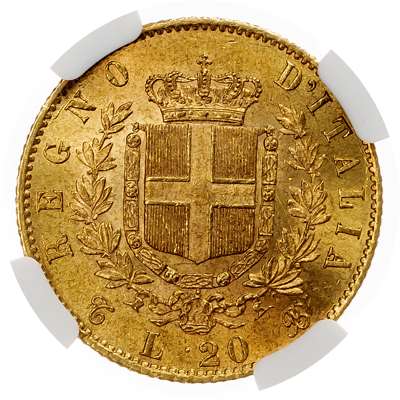 Italy. Vittorio Emanuele II AV 20 Lire. 1863T. VITTORIO EMANUELE II date below bust left, FERRARIS / REGNO D'ITALIA, T L.20 BN. KM 10.1. 6.4516g, 21.00mm, 5h.