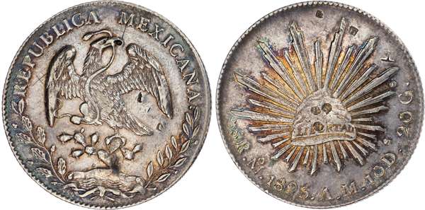 Mexico, Republic AG 8 Reales, Chinese traders chop marks in fields. 1895 AM. LIBERTAD, ✶8R. Mo. Date. A.M. 10D. 20 G. liberty cap within rays centre, chop marks / REPUBLICA MEXICANA. Eagel with snake in beak atop a cactus plantlaurel & oak below, chop marks in fields. KM 377.10. 26.94g, 38.50mm, 6h.