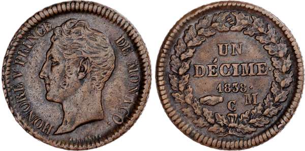 Monaco. Honore V CU Decime.. 1838 CM. HONORE V PRINCE DE MONACO, BORREL F. below bust left / UN DÉCIME, date CM, mm below in wreath. KM 97.1. 18g, 33mm, 6h.