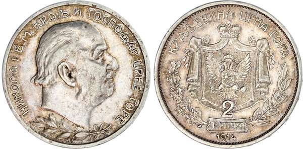 Montenegro, Kingdom. Nicholas I AR 2 Perpera. 1914.