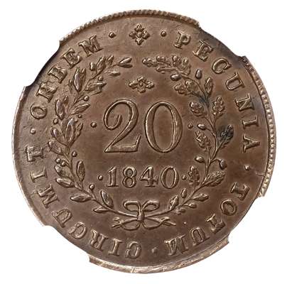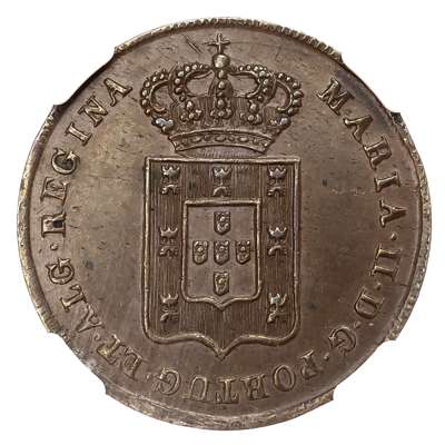 Mozambique, Portuguese Colonial. Maria II CU 20 Reis. 1840. MARIA •II• D •G• PORTUG• ET• ALG• REGINA Crowned shield / PECUNIA.TOTUM.CIRCUMIT.ORBEM ✥ value and date withinj wreath centre. KM 21. 3.7g, 25mm, 12h. NGC Graded MS 64 Brown. Rare one year type. Top Pop.