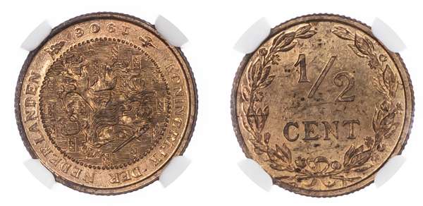 Netherlands. Wilhelmina CU 1/2 Cent. 1906. KONINGRIJK DER NEDERLANDEN, mm and date below, A lion (crowned, facing left, holding a sword in right paw and seven arrows in left paw) in the centre within a beaded circle / denomination in wreath. KM 133. 1.25g, 14mm, 6h.