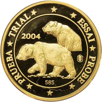 European Union. Trial, Proba, Essai or Pattern Gold 5 Euro. 2004. ESSAI, PROBE, PRUEBA, TRIAL, .585 date to left of bears, 8 stars in legends / E SPECIMEN, Liberty seated, denomination right, 6 stars facing 6 stars on rods. 3.11g, 21.00mm, 12h.