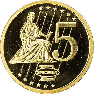 Choice Proof. Struck in Netherlands as a test piece for a proposed Gold 5 Euro standard coin. (15 Carat)