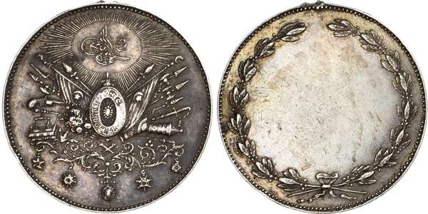 Ottoman Empire. Abdul Aziz II AR Medal, "For Industry". 1876-1918. Toughra in cartouche emitting sun rays over central shield with drapes and implements of war around, sat on ornate design / wreath around, blank. Suspension loop removed at 12 o'clock. NP: 1119. 13.77g, 30.50mm, 12h.