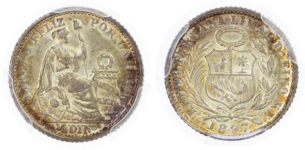 Peru. Republic AR 1/2 Dinero. 1897VN. REPUB.PERUANA LIMA 9D:FINO J.F. date below Coat of Arms / FIRME Y FELIZ POR LA UNION, LIBER TAD, denomination in exerhue, seated Statue of Liberty with the Union shield (sun) & Cap of liberty. KM 206. 1.25g, 15mm, 6h.