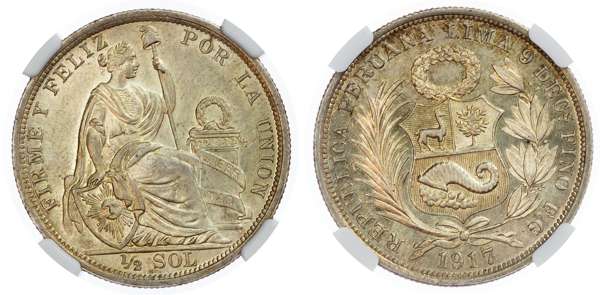 Peru, Republic AR 1/2 Sol. 1917FG. FIRME Y FELIZ POR LA UNION, Liberty seated to right; denomination in exergue / REPUBLICA PERUANA LIMA 9 DEC s FINO F.G., national coat of arms; date below. KM 203.