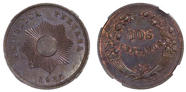 Peru. Republic CU 2 Centavos. 1935. REPUBLICA PERUANA, date below radiant sun / denomination within two cornucopias. KM 212. 5.00g, 23.93mm, 6h.