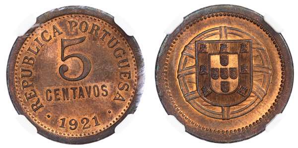 Portugal. First Republic CU 5 Reis. 1921. National coat of arms - armillary sphere under Portuguese shield of arms. Beaded border / REPUBLICA PORTUGUESA, denomination centre with date below, bead border. KM 569. 8g, 25mm, 12h.