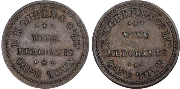 South Africa. Cape Town CU Farthing Token. 1896-1900. E K GREEN & CO. LTD. CAPE TOWN, WINE ✷ MERCHANTS ✷ / E.K. GREEN & CO. LTD. CAPE TOWN, WINE ✷ MERCHANTS ✷. Recut type. Theron-C16, Hern: 2520. 1.62g, 21.00mm, 12h.