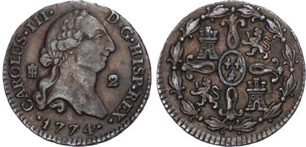 Spain. Carlos III CU 2 Maravedis. 1774.
