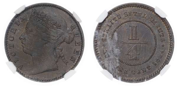Straits Settlements, British Colonial. Victoria CU 1/4 Cent. 1884. VICTORIA QUEEN bust left divided legend / •STRAITS SETTLEMENTS• QUARTER CENT date, denomination centre. KM 7a. 2.33g, 18.00mm, 6h.