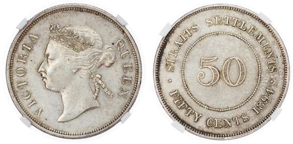 Straits Settlements, British Colonial. Victoria AG 50 Cents. 1894.