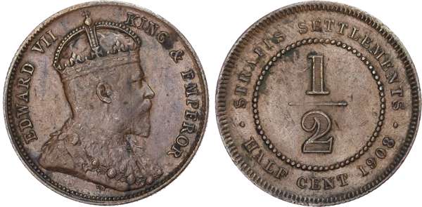 Straits Settlements, British Colonial. Edward VII CU 1/2 Cent. 1908. EDWARD VII KING & EMPEROR, DeS below bust right / · STRAITS SETTLEMENTS · HALF CENT date, denomination centre. KM 18. 4.66g, 23mm, 12h.