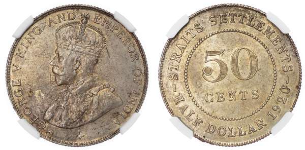 Straits Settlements, British Colonial. George V AR 50 Cents. 1920.