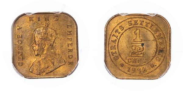 Straits Settlements, British Malaysia. George V CU 1/2 Cent. 1932. GEORGE V KING EMPEROR, bust left on square planchet / STRAITS SETTLEMENTS, date below, denomination centre. KM 37. 2.91g, 18.50mm, 12h.
