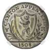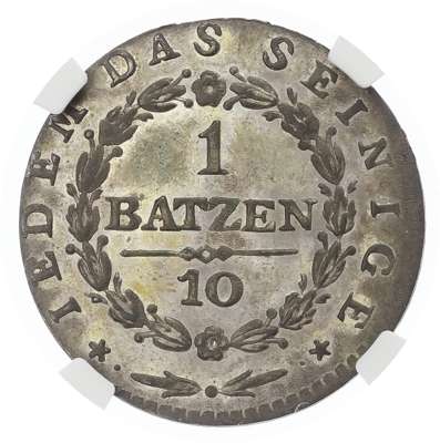 Switzerland, Cantonial. Apenzell Bi Batzen. 1808. CANTON APPENZELL, V R divided by shield with rampant bear facing left, date below in exergue / IEDEM DAS SEINIGE, ✮ - - ✮ denomination in wreath. KM 6. 2.42g, 24mm, 6h. NGC Graded MS 63. Scarce.