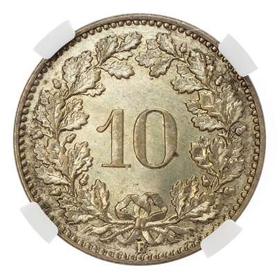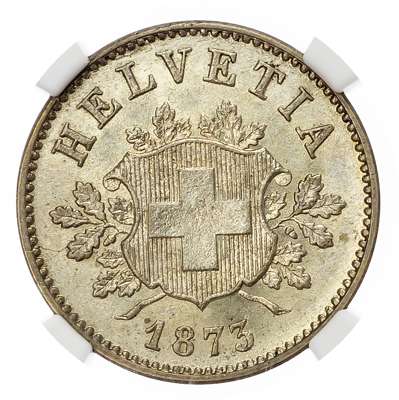 Switzerland. Federal State Bi 10 Rappen. 1873B. HELVETIA, date below Coat of Arms / B below denomination in wreath. KM Y21. 2.5g, 19.15mm, 12h. NGC Graded MS 66. Top Pop, no coins graded higher. Rare.