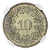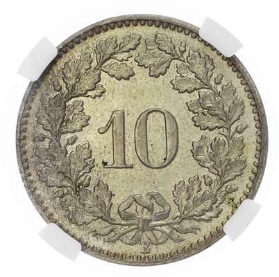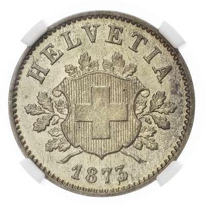 Switzerland. Federal State Bi 10 Rappen. 1873B. HELVETIA, date below Coat of Arms / B below denomination in wreath. KM Y21. 2.5g, 19.15mm, 12h. NGC Graded MS 65. Only 4 coins graded higher.