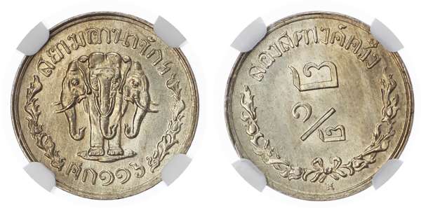 Thailand. Rama V Cu Ni 2.5 Sarang. RS116 (1897). สยามอานาจักร, ศก๑๑๖ facing elephant with elephant heads flanking, sprays to sides / สองสตางค์ครึ่ง, denomination centre in wreath, mm below. KM Y24. 1.80g, 16mm, 12h.