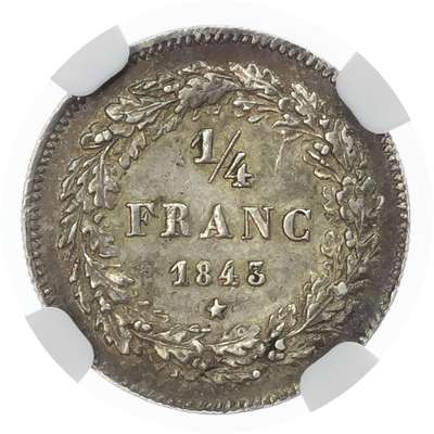 Belgium. Leopold I AR 1/4 Franc. 1843. LEOPOLD PREMIER ROI DES BELGES, BRAEMT F. on truncation, bust left / denomination & date with star below in wreath. KM 8. 1.25g, 15mm, 6h. NGC Graded AU 58. Only 8000 pieces minyted this year. Rare.