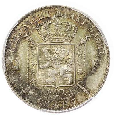 Belgium. Leopold II AR 1 Franc. 1887. LEOPOLD II KONING DER BELGEN, L. WEINER below bust left / EENDRACHT MAAKT MACHT, date and denomination divided by Coat of Arms. KM 29. 5g, 23mm, 7h. PCGS Graded MS 65. Superb old toning.