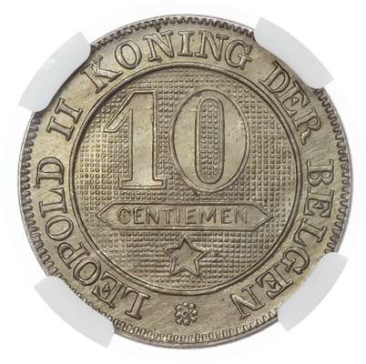 Belgium. Leopold II Cu-Ni 10 Centimes. 1901. Dutch Text. EENDRACHT MAAKT MACHT, BRAEMT, ★ date ★ Rampant Lion on matrix / LEOPOLD II KONING DER BELGEN, denomination centre on matrix. KM 43. 4.5g, 21mm, 6h. NGC Graded MS 66. Only one graded higher.
