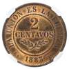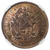 Bolivia, Republic CU Essai 2 Centavos. 1883 EG. REPUBLICA BOLIVIANA, Crossed flags and weapons behind condor topped oval arms, stars below / LA UNION ES LA FUERZA, ESSAI, denomination centre in wreath, date below. KM 168. 9.8g, 30mm, 6h. NGC Graded PF 65 Red Brown. Top Pop, rare.
