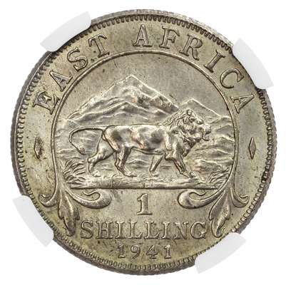 East Africa, British Colonial. George VI AR 1 Shilling. 1941 I (bombay). Thick Rim. GEORGIVS VI REX ET INDIAE IMPERATOR:, PM below bust left / EAST AFRICA, denomination and date below lion walking right in landscape. Thick Rimmed variety. KM 28.2. 7.8g, 27.80mm, 12h. NGC Graded AU Details, surface hairlines. These are not easilly visible. Very Rare variety.