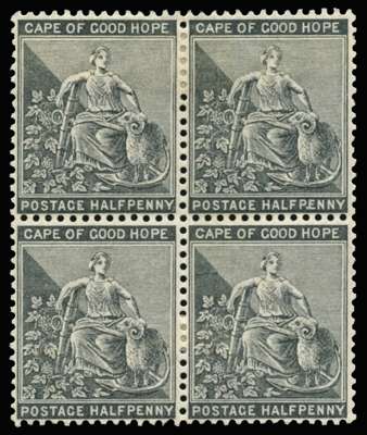 1882-83 ½d black, wmk CA, well-centred block of 4, fresh large part o.g. Heavily hinged on upper pair, but fine appearance. A scarce block. (cat £192+)