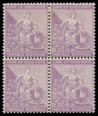 1882-83 6d mauve, wmk CA, block of 4, large part o.g. Slight gum creasing and a couple of short perfs, still attractive and very scarce. (cat £680+)