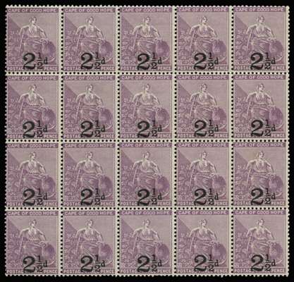1891 2½d on 3d deep magenta, block of 20 (5x4), the top left stamp showing variety "1" with horizontal serif (pos. 8 of the setting), o.g. (18 stamps unmounted). Odd minor gum wrinkles and a couple of insignificant tone specks, still very fresh and fine appearance. A very interesting and scarce multiple, showing a distinctive short bar to fraction on pos. 10 (2mm instead of 2½mm) and six examples of the sloping serif to "d".