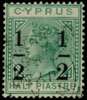 1886 "½" on ½pi emerald-green, wmk CA, type 10 surcharge with 8mm space, showing variety "Large 2 at right" (R3/4 in the setting of 60), lightly cancelled by part Nikosia squared circle, dated "JY 30 86". Small inclusion on reverse but very fine appearance. (cat £350)