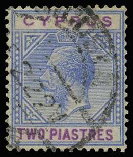 1921-32 Script wmk 2pi blue and purple, variety "Broken bottom left triangle" (right pane, R10/6), lightly used with large part FAMAGUSTA cds, dated "15.2.22", which leaves variety clear. Unobtrusive corner crease but very scarce. (cat £425)