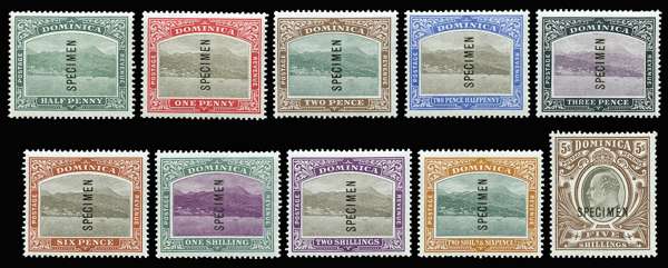 1903-07 set of 10 to 5s, wmk CC, opt "SPECIMEN", brilliant o.g. A couple of minor blemishes (2s6d short perf, 5s bend) but exceptionally fresh. Far above average. (cat £180)