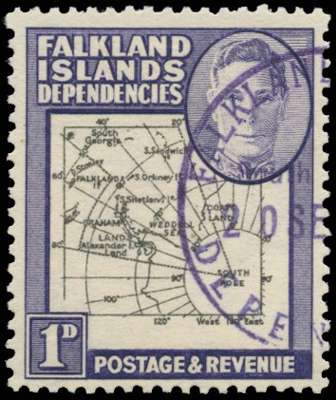 1946 'Thick Map' 1d black and violet, vignette plate '1', variety 'Extra Island' and 'Gap in 80th parallel' (R3/9), very fine used. Scarce.