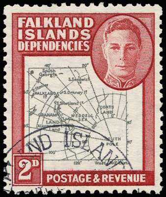 1946 Thick Map 2d black and carmine, Plate 1 R3/9 extra island and 'Gap in 80th parallel', used with part black South Georgia CDS. A couple of perfs at top fractionally short, otherwise very fine, cat £350