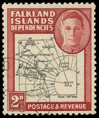 1946-49 "Thick Map" 2d black and carmine, variety "Extra island" (with Gap in 80th parallel) from vignette plate "1", R3/9, fine used with part type SG7 "South Georgia" cds, which leaves variety clear. The scarcest value with this variety.