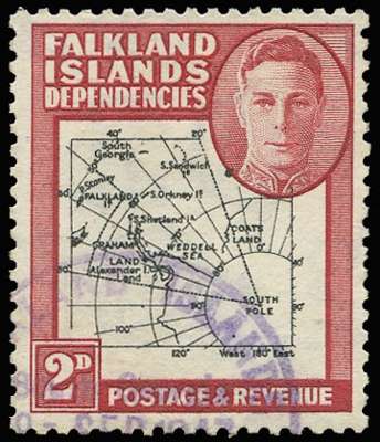 1946 Thick Map 2d black and carmine used with part violet South Georgia CDS of SEP 47, Plate 1 R3/9 extra dot by oval