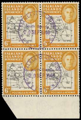 1946 'Thick Map' 6d black and ochre, the scarce shade, lower marginal block of 4 from vignette plate '2', the lower right stamp variety 'SOUTH POKE' (R6/8), centrally cancelled by two very fine strikes of type SG6 'South Georgia' cds, dated '20 SEP 1946'. Attractive and very rare in this form and condition, and the first used example of the variety we can recall handling. Ex Ivor Little.