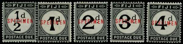 Postage Due. 1918 set of 5 to 4d, opt "SPECIMEN" (type D12 in red), large part o.g. (½d) or o.g. Odd shortish perfs, and 2d, 4d each with minor gum tones, still an attractive set, fresher than usually found. (cat £160)