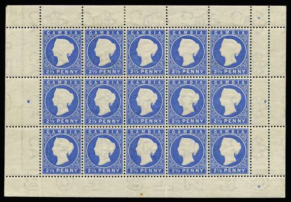 1886-93 2½d ultramarine, wmk CA (sideways), complete sheet of 15 (5x3), first comb perforation, o.g. (stamps unmounted). Faintly yellowish gum, still very fine fresh appearance. Attractive and scarce in this form.