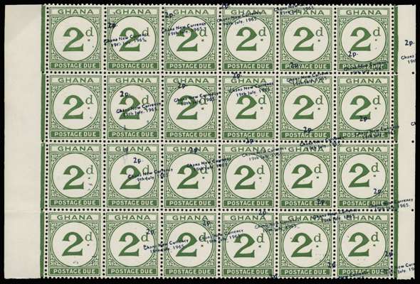 Postage Due. 1965 New Currency 2p on 2d green, type D4 surcharge (horizontal), block of 24 (6x4) with sheet margins at sides, the surcharge misplaced diagonally upwards to the right, the first column error SURCHARGE OMITTED, unmounted o.g. An exceptionally interesting multiple, the first column with a significant paper fold resulting in partially reversed albino impressions of the surcharge on three of the four stamps. (cat £340+)