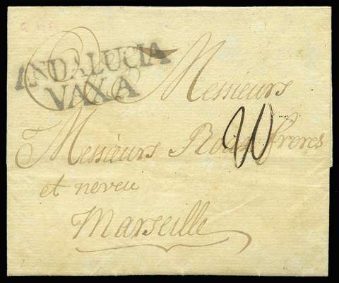 1789 (10 Aug) entire letter (in French) from Gibraltar to Marseille, sent by the Spanish overland route, with a fine (slightly over-inked) strike of the rare "ANDALUCIA / VAXA" H/S in black and M/S "20" rate mark on face. Fractionally toned still fine and neat.