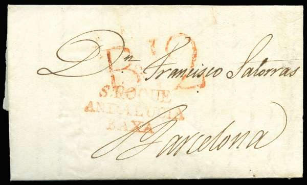 1820 (27 July) entire letter (in Spanish) from Gibraltar to Barcelona, sent by the Spanish overland route, showing on face mainly fine strikes of three-line "S.ROQUE / ANDALUCIA / BAXA" transit and "B 12" arrival handstamps in red. Very neat and clean.