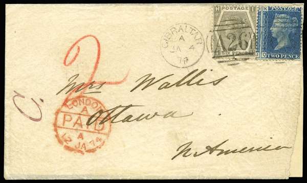 1874 (JA 4) cover from Gibraltar to Ottawa, franked at 8d by Great Britain 1858-69 2d blue, plate 14, and 1873 6d grey, plate 12, tied by individual strikes of "A26" with despatch cds alongside. Red London transit cds (12 JA) and crayon "2" rate mark at left. Backstamped at Ottawa (FE 2). Envelope fractionally reduced at right and 6d creased still a neat usage, with the 6d very scarce used on cover.